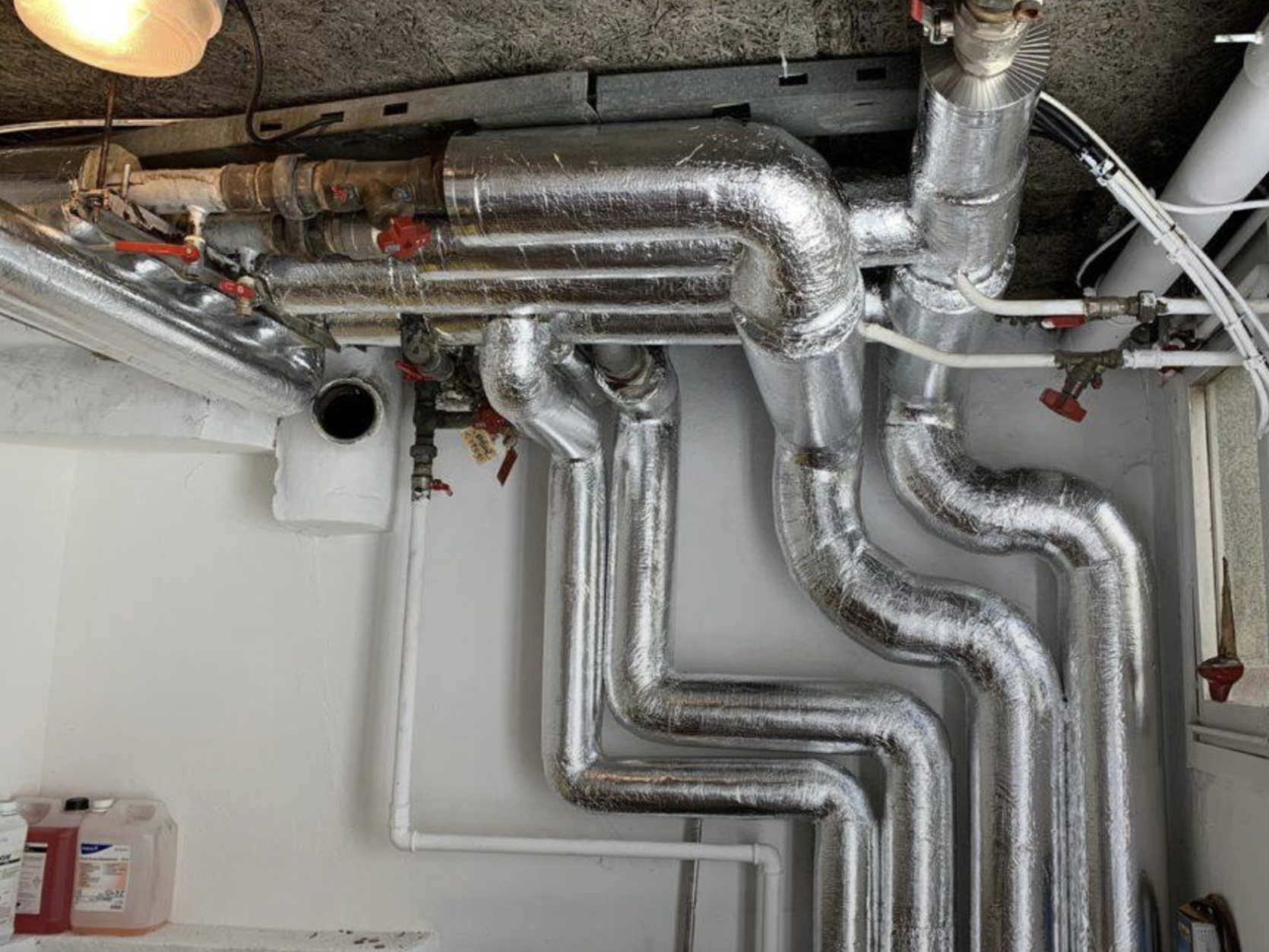 Nous réalisons l’isolation des tuyauteries d’Eau Chaude Sanitaire (ECS) et de chauffage du réseau hors volume de chauffe (caves, parkings, vides sanitaires…) en sections horizontales (pas de traitement des colonnes montantes) en classe 4 avec deux finitions (PVC ou aluminium).